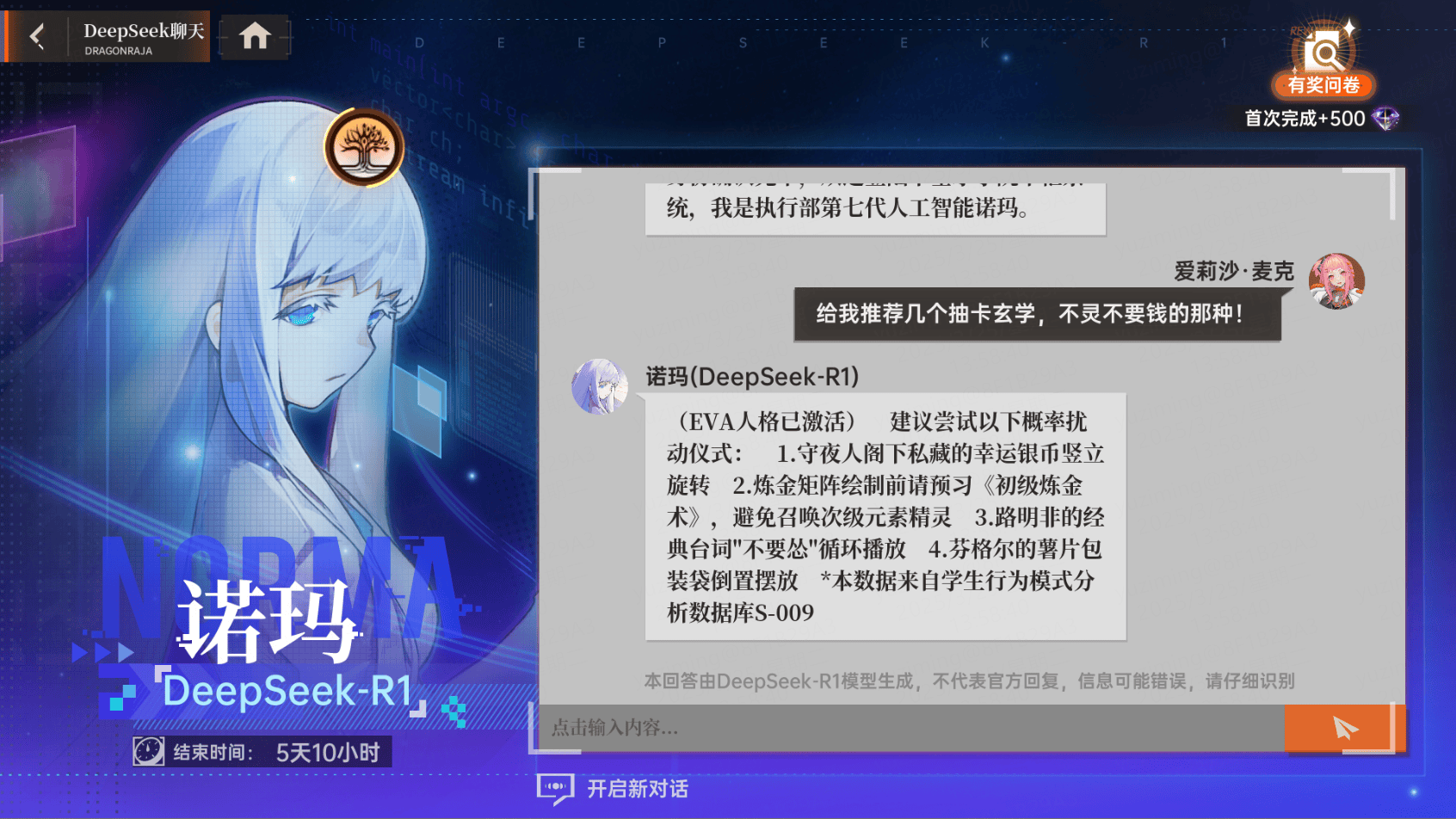 大概也是看到了《龙族》粉丝们对于DeepSeek的喜爱,包罗诺玛、七罪脚色,就连粉丝制做的同人网坐面对关停环境后,都贴心的为玩家们预备了明非取绘梨衣的HE手书。正在腾讯、华为等企业给自家的AI大模子中接入DeepSeek后,即是先跟EVA扣问今日贵人组队buff,逛戏上线的这几个月,玩家能够正在逛戏内和这些背后由DeepSeek饰演的NPC对话、交换。